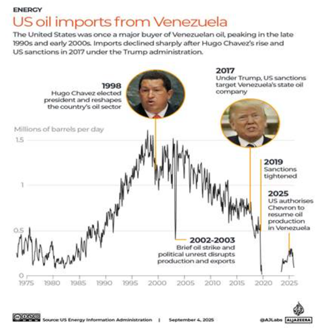 <미국의 베네수엘라산 원유 수입> 미국은 한때 베네수엘라 원유의 주요 구매국이었으며, 수입량은 1990년대 후반과 2000년대 초반에 정점에 달했다. 그러나 우고 차베스의 집권과 트럼프 행정부가 2017년에 부과한 미국의 제재 이후 수입량은 급격히 감소했다.