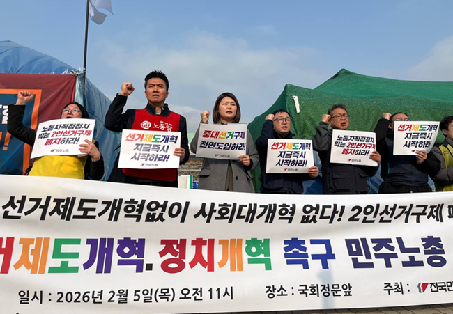 민주노총은 2인 선거구제가 단순한 양당 독식 구조를 넘어, 사회적 갈등을 증폭시키는 위험 요소가 되고 있다고 주장했다. 최윤수 서비스연맹 정치담당국장은 “2인 선거구제는 내란 세력에게까지 의석 진입 가능성을 열어주는 구조”라며 “광장에서 분출된 사회대개혁 요구를 지방정치에 담기 위해서는 3~5인 중대선거구제 확대가 불가피하다”고 말했다.