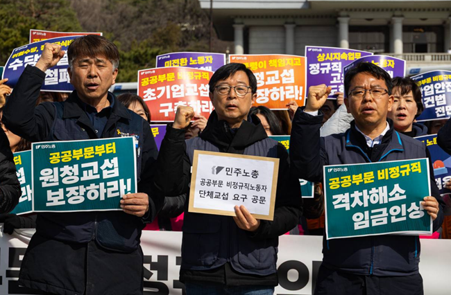 이양수 민주노총 부위원장은 “공공부문 비정규직 노동자들은 공무원과 동일한 공공서비스를 제공하면서도 저임금과 고용불안을 감내하고 있다”며 “기관별 단체교섭을 시도했지만 예산과 인건비 기준이 정부 지침에 묶여 있어 실질적인 변화가 어려웠다”고 말했다. 이어 “정부가 예산과 지침으로 임금과 처우를 결정한다면 사용자로서 책임 있게 교섭에 나서야 한다”고 밝혔다.