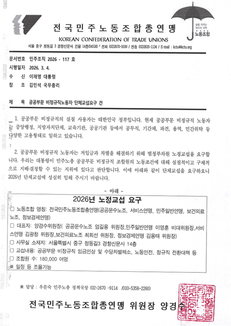 민주노총이 공공부문 비정규직 노동자 처우 개선을 위해 정부와의 노정교섭을 요구했다.