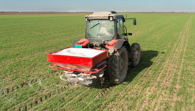 한 농부가 인공 비료를 밭에 살포하고 있다. 이 비료는 전 세계 식량 체계에서 없어서는 안 될 요소가 되었다. 출처: Unsplash+, Getty Images