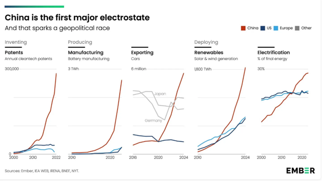중국은 전형적인 전기국가의 사례로 지목되어 왔다중국은 최종 에너지 사용 가운데 전기의 형태로 공급되는 비중을 확대해 왔다여기에 더해 지난 5년 동안 재생에너지는 전력 생산에서 가장 빠르게 성장하는 형태로 자리 잡았다더 나아가 중국 제조업체들은 전기차(EV) 산업을 지배하고 있으며내연기관이 빠르게 대체될 것이라는 전망을 현실로 끌어오고 있다초고속(전기화된철도는 중국 내 지역 간 항공 이동과 경쟁하고 있다그리고 중국은 국가가 핵심적인 역할을 수행하는 혼합경제 체제이기도 하다따라서 중국은 전기국가의 모든 조건을 충족한다.