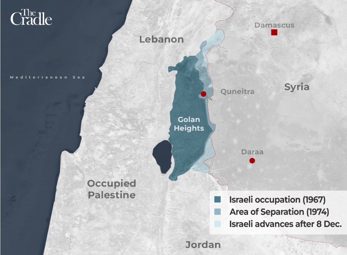 바샤르 알 아사드 정부 붕괴 이후 이스라엘 군이 점령한 시리아 영토를 보여주는 지도. 출처: the cradle