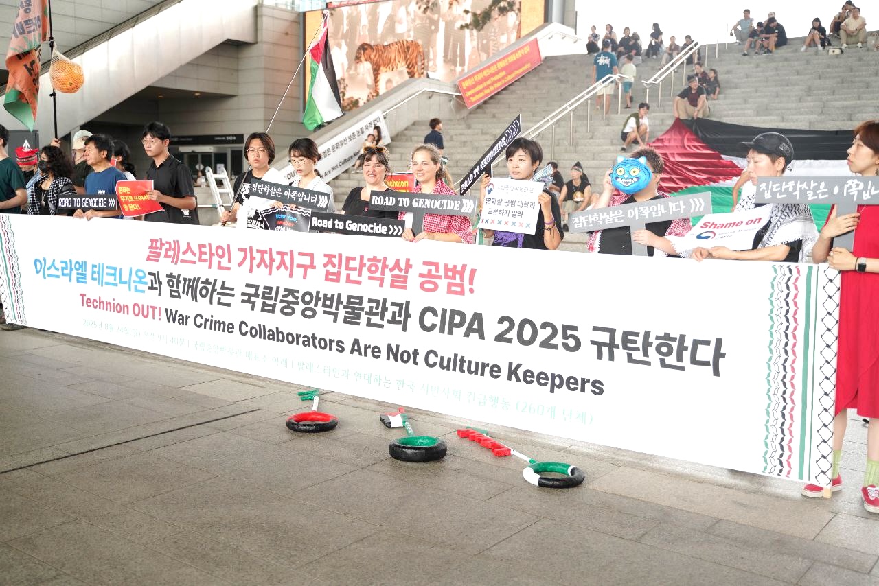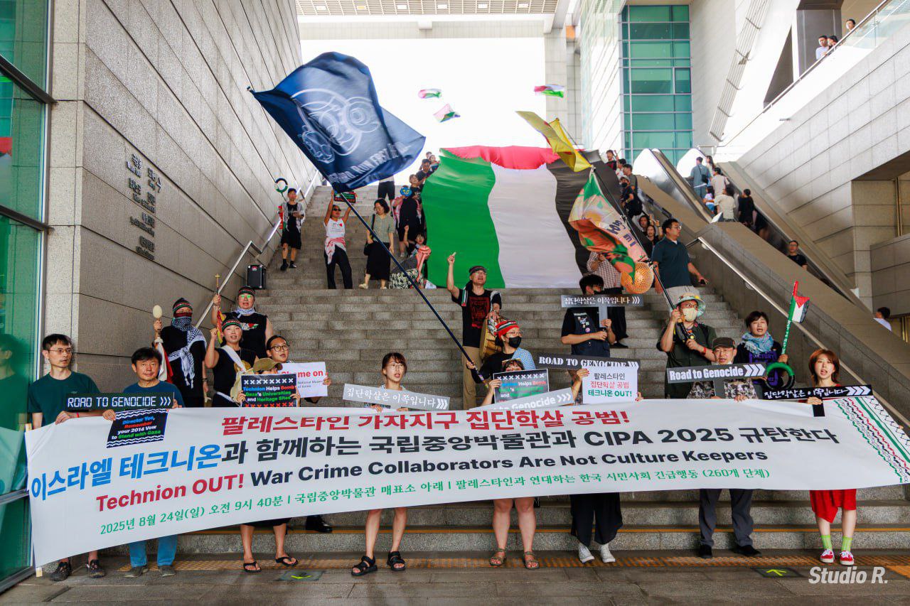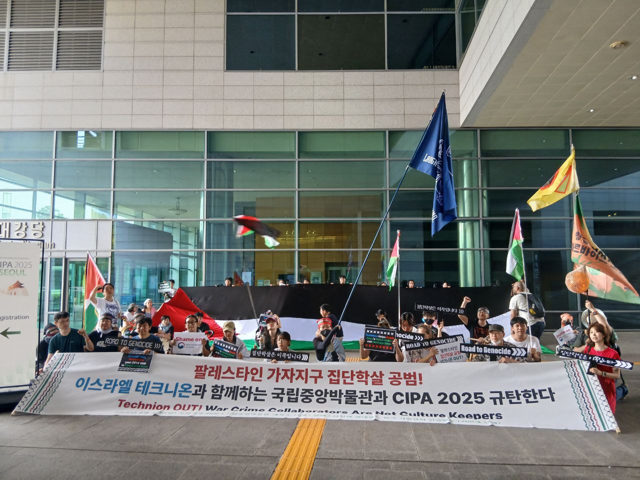 ‘팔레스타인과 연대하는 한국 시민사회 긴급행동’(이하 ‘팔레스타인 긴급행동’)은 24일 오전, CIPA가 열리는 서울 용산구 국립중앙박물관에서 기자회견을 열고, 이스라엘 테크니온 공과대학(Technion IIT)은 “팔레스타인 집단학살 공범”이라며 이들이 주최하는 워크숍을 심포지엄 프로그램으로 편성한 조직위원회와, 심포지엄 공동주관 단위에 “전쟁 범죄 연루 기관과의 모든 학술 교류를 동결해야 한다”고 촉구했다.