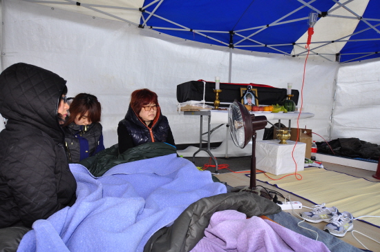 지난달 폭설로 지붕이 무너지면서 숨진 현대공고 현장실습생 김대환군 유족이 빈소를 공장 안에 차리고 노숙을 하고 있다. 유족은 한달째 장례를 못 ...