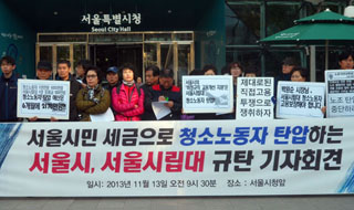 공공운수노조연맹 서경지부는 13일 오전, 서울시청 앞에서 기자회견을 열고 “서울시와 서울시립대가 서울시민의 세금으로 청소노동자를 탄압하고 있다”...