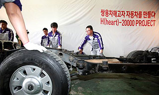 쌍용차 해고자들이 직접 분해, 조립해 만든 자동차가 7일 시청광장에서 공개된다. 2009년 해고되고, 4년 만에 작업복에 기름때 묻히며 H-20...