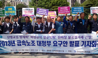 금속노조는 15일 오전, 광화문 정부종합청사 앞에서 기자회견을 열고 정부에 △산별교섭 법제화 △비정규직 정규직화 △원하청 공정거래 등 2013년...
