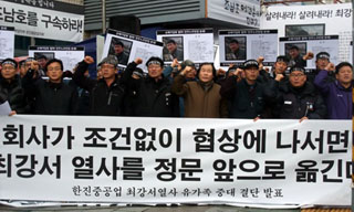 최강서 열사 유가족과 민주노총, 금속노조, 한진중공업지회 등은 4일 오전, 한진중공업 정문 앞에서 기자회견을 열고 “회사 측이 설 전에 사실상 ...