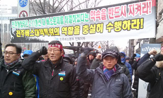 전북버스 노동자가 조명탑 위에 올라 고공농성을 이어가고 있는 가운데 전북버스노조가 민주당에 대선 전 문제 해결을 촉구하는 집회를 열었다.
