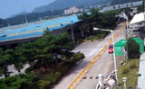 공장 정문에서 깁스 공장까지, 200미터도 안 돼 보이는 길이지만 용역직원 6명이 따라붙는다. 회사는 깁스 공장 주변을 노란 안내판으로 둘러쳤다...