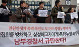 삼성노조와 다산인권센터 등이 9일 오후 1시 수원 남부경찰서 앞에서 경찰측을 규탄하는 기자회견을 가졌다. 이들은 남부경찰서측이 삼성에서 해고당한...