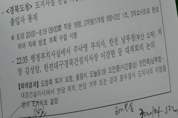 경북도청이 김관용 도지사의 청도 송전탑 반대 주민 체포 지시 의혹을 부인했다. 도청 방호책임자인 우병윤 안전행정국장의 결정이었다는 것.