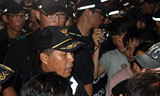 제주해군기지 공사 재개로 강정마을 주민과 연대 단체 회원, 평화운동가들이 대치하는 가운데 경찰이 강동균 마을회장 등 5명을 강제 연행하자 밤 1...