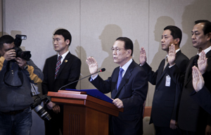 10여 미터 길이의 현관 입구 레드카펫 양 옆엔 세월호 유가족 50여명이 피켓을 들고 경찰과 경호원들에게 겹겹이 둘러싸여 대통령을 기다리고 있었...