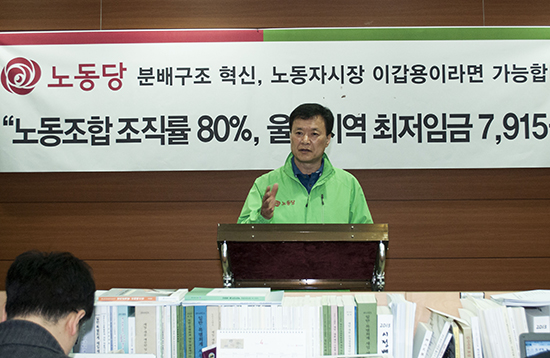 노동당 이갑용 울산시장 후보는 3일 오전 시의회 기자실에서 ‘노동조합 조직률 80% 달성’과 ‘울산지역 최저임금 7,915원’을 첫 공약으로 걸...