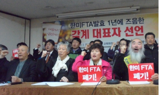한미FTA 발효 1년을 계기로 각계 대표들이 모여 현장의 목소리를 전하며 투쟁 의지를 밝혔다. 고조되는 한반도 위기 아래 한미FTA를 한미동맹 ...
