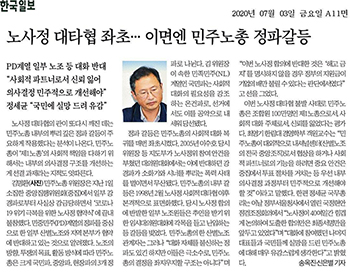 ‘코로나19 위기극복을 위한 노사정 합의안 최종안’을 두고 김명환 민주노총 위원장이 대의원대회 소집을 강행하는 가운데, 노사정 합의안을 폐기해야...