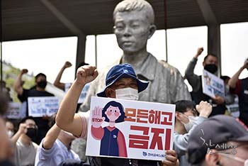 공공운수노조 소속 500여 명의 노동자들이 세계노동절을 맞아 코로나19 상황에서 모든 해고를 금지하라는 공동행동을 벌였다.