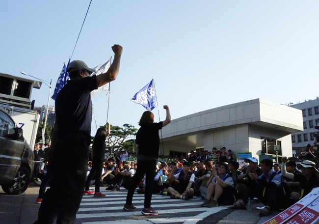 고용노동부가 기아자동차 불법파견 문제를 두고 ‘반쪽짜리’ 시정명령을 내리자, 이에 반발한 비정규직 노동자들이 1일 서울고용노동청 점거 농성에 돌...