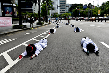 노조는 23일 오전 9시 국회 앞에서 오체투지를 시작했다. 이날 기온은 33도, 체감온도는 36도에 육박했다. 오체투지에 참여한 노동자 약 10...