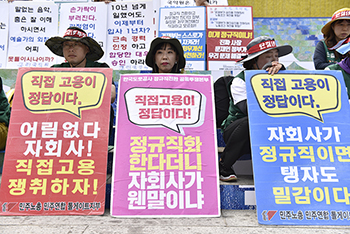 비정규직 노동자 200명이 27일 세종문화회관 계단에서 문재인 정부의 반 노동 정책을 규탄했다. 이날 노동자들은 '죽거나', '잘리거나', '속...