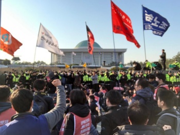 노동법 개악 저지를 위한 민주노총의 대국회투쟁 2일 차, 민주노총 임원과 조합원 등 8명이 국회에 진입해 본청 앞에서 연좌 농성을 벌이다 모두 ...