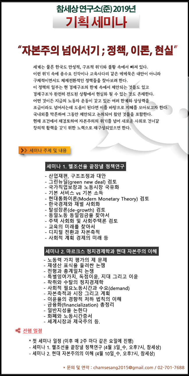 이번 세미나는 크게 두 개의 팀으로 진행하고 각 팀에서 두 개의 주제에 대해 연속적으로 진행한다. 첫 번째 팀은 자본주의를 넘기 위한 정책과 현...