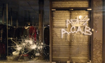 깨진 유리창 옆에 쓰인 A.C.A.B. ‘All Cops Are Bastards!’(모든 경찰은 나쁜 녀석들이다)의 약자다. 2008년 금융자본...