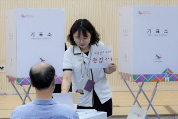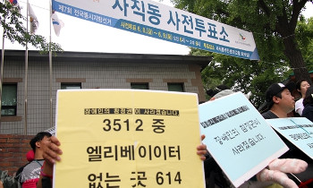 지방선거 사전투표 마지막 날인 8일, 서울 종로구 사직동사전투표소가 설치된 사직동주민센터에는 사람들이 붐볐다. 하지만 이곳에 모인 장애인들은 높...