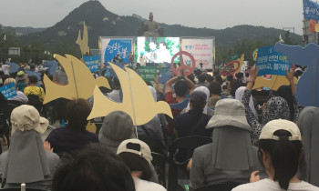 서울 미 대사관 앞에서 1천여 명이 전쟁 종식과 평화를 위해 촛불을 들었다. 북미정상회담을 앞둔 가운데, 평화촛불추진위원회가 6.9 평화촛불 집...