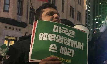 “트럼프의 예루살렘 선언, 강력 규탄한다” “이스라엘은 예루살렘을 떠나라” “프리 프리 팔레스타인” “예루살렘은 팔레스타인의 수도다” 서울 광화...