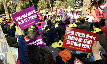 “‘사랑과 봉사의 정신만 있으면 누구나 할 수 있는 일’이라며 최저임금도 주지 않는 국가, 사회서비스 노동의 가치를 ‘후려치기’하는 국가를 규탄...