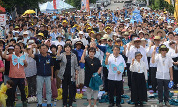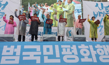 광복 72주년을 맞이해 주권 회복과 한반도 평화실현을 위한 8.15 범국민대회가 열렸다. 대회에 참가한 1만여 명은 쏟아지는 빗줄기에도 자리를 ...