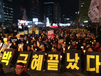 8,000명이 넘는 시민이 9일 저녁 청계광장에서 0도의 날씨에도 촛불을 들었다. 시민들은 새누리당의 거국중립내각 구성, 야당의 하야 민심 외면...