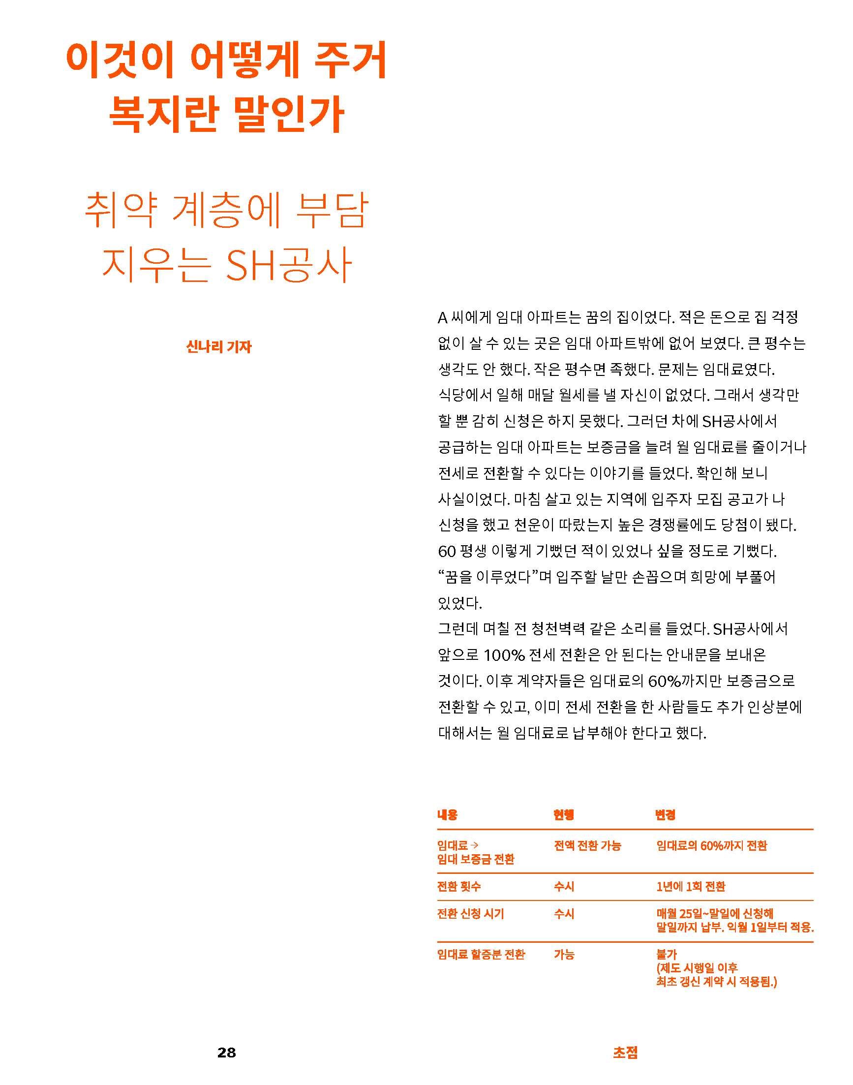 SH공사가 부채를 이유로 임대 주택에 대한 전세 전환을 금지했다. 입주민들의 월세(월 임대료) 부담을 늘리는 방향으로 정책을 바꾼 것이다. 월세...
