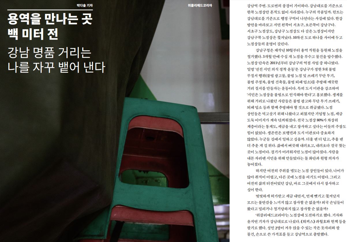 강남역 주변. 도로변의 풍경이 기이하다. 강남대로를 기준으로 한쪽 노점상만 흔적도 없이 사라졌다. 누구의 작품일까. 힌트는 강남대로를 기준으로 ...