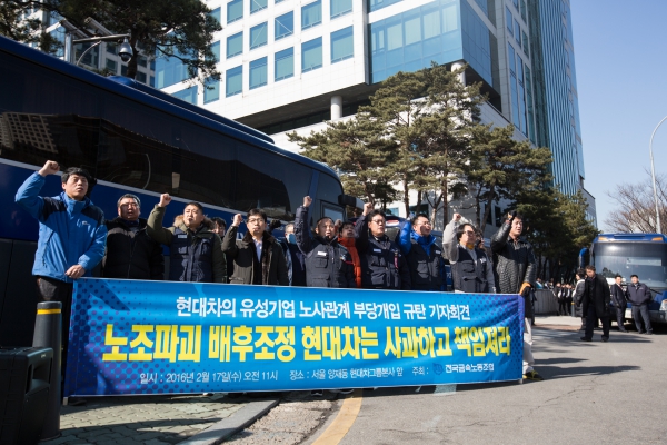 전국금속노동조합이 17일 오전 11시, 양재동 현대차그룹 본사 앞에서 기자회견을 열고 ‘유성기업 노조파괴 배후조종’에 대해 현대차가 사과할 것을...