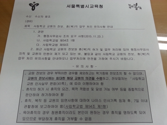 동료교사들에게 세월호 참사 추모글을 보냈거나 대형마트 노동자들의 노동조합 활동을 담은 드라마를 학생들에게 보여줬다는 이유로 교사들을 강제로 전보...