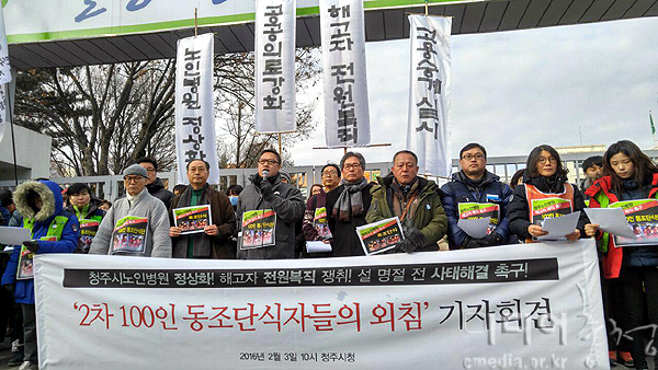 충북지역 노조와 정당, 시민사회단체는 청주시가 법에 따라 노인전문병원 노동자 고용승계 의무를 이행하라고 촉구하며 3일 2차 하루 100인 동조단...