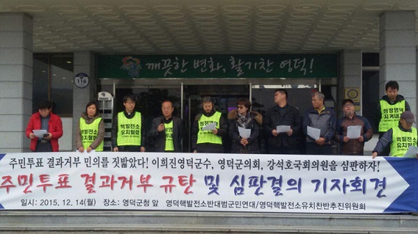 영덕핵발전소 유치찬반 주민투표가 치러진 지 한 달, 영덕 시민단체들이 영덕군수와 군의회 등에 투표 결과 수용을 요구하고 나섰다.