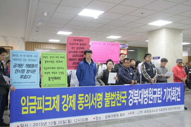경북대병원이 임금피크제 도입 개별 동의를 받는 가운데, 관리자가 서명 여부를 감시, 강요하는 등 불법적으로 진행하고 있다는 주장이 제기됐다.