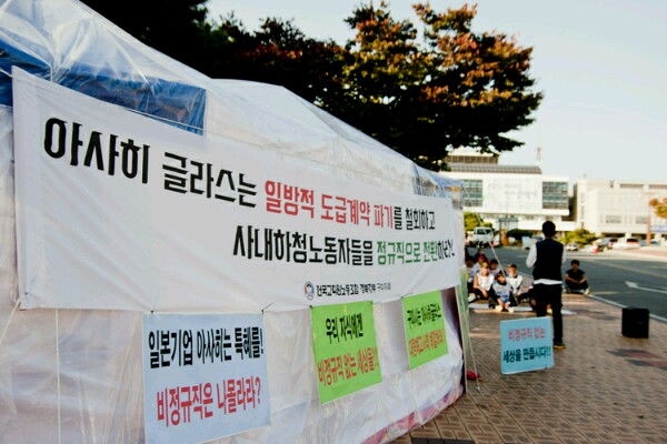13일 구미시 노사민정실무협의회가 아사히글라스 문제 해결을 위한 간담회를 열었다. 대량 해고 사태 100여 일 만이다. 간담회 자리에는 아사히글...