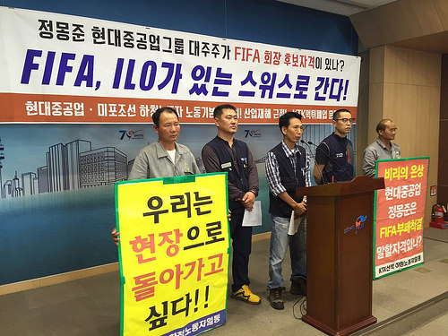 현대중공업그룹 최대주주인 정몽준 대한축구협회 명예회장이 국제축구연맹(FIFA) 회장 후보로 나선 가운데 현대중공업 하청노동조합이 스위스로 가 하...