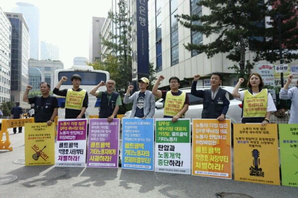 노조 인천지부 콜트악기지회(지회장 방종운)와 대전충북지부 콜텍지회(지회장 이인근)가 9월23일 여의도 새누리당사 앞에서 ‘김무성 새누리당 대표의...