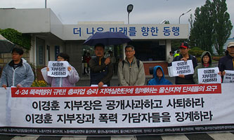 총파업 승리 지역실천단을 구성한 9개 단체가 30일 현대자동차 공장 정문 앞에서 기자회견을 열고 이경훈 전국금속노동조합 현대자동차지부장이 폭행 ...