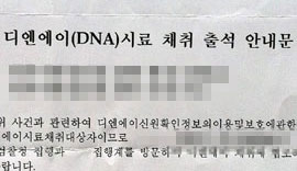 최근 지방검찰청로부터 디엔에이(DNA, 유전자정보) 시료 채취 출석 안내문을 받은 A씨가 9일 오전 검찰에 디엔에이 시료 채취 부동의 의견을 냈...