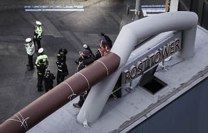 LG유플러스와 SK브로드밴드 비정규직 노동자 2명이, 비정규직 노동자 생존권 및 노동인권 보장을 요구하며 15m높이의 광고판에 올랐다. 현재 S...