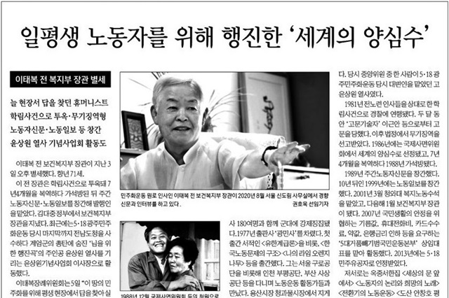 그의 죽음을 놓고 언론은 ‘일평생 노동자를 위해 행진한 세계의 양심수’(경향신문 12월6일 21면)라거나 ‘노동운동에 평생 헌신한 세계의 양심수...