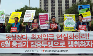 2015년부터 적용될 최저임금 논의가 본격화되면서, 민주노총이 최저임금 현실화를 위한 집중 투쟁에 돌입했다. 민주노총은 6월 한 달 간 기자회견...